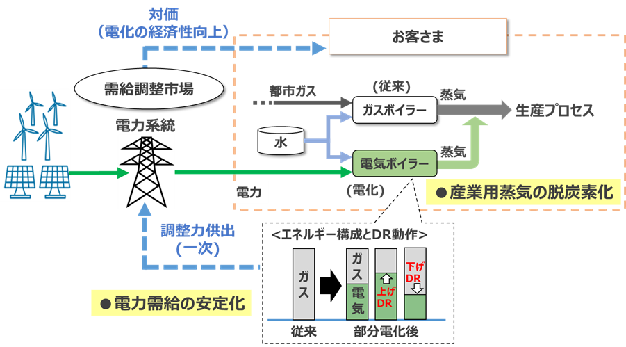 本実証は、蒸気生成用途の電気ボイラーをデマンドレスポンス(DR)リソースとして活用し、産業用蒸気の脱炭素化と調整力供出による電力需給の安定化を両立させる技術の確立を目的としています。電気ボイラーをDRリソースとして位置づけ、一次調整力としての供出を見据えた実証は国内初※1の取組みです。